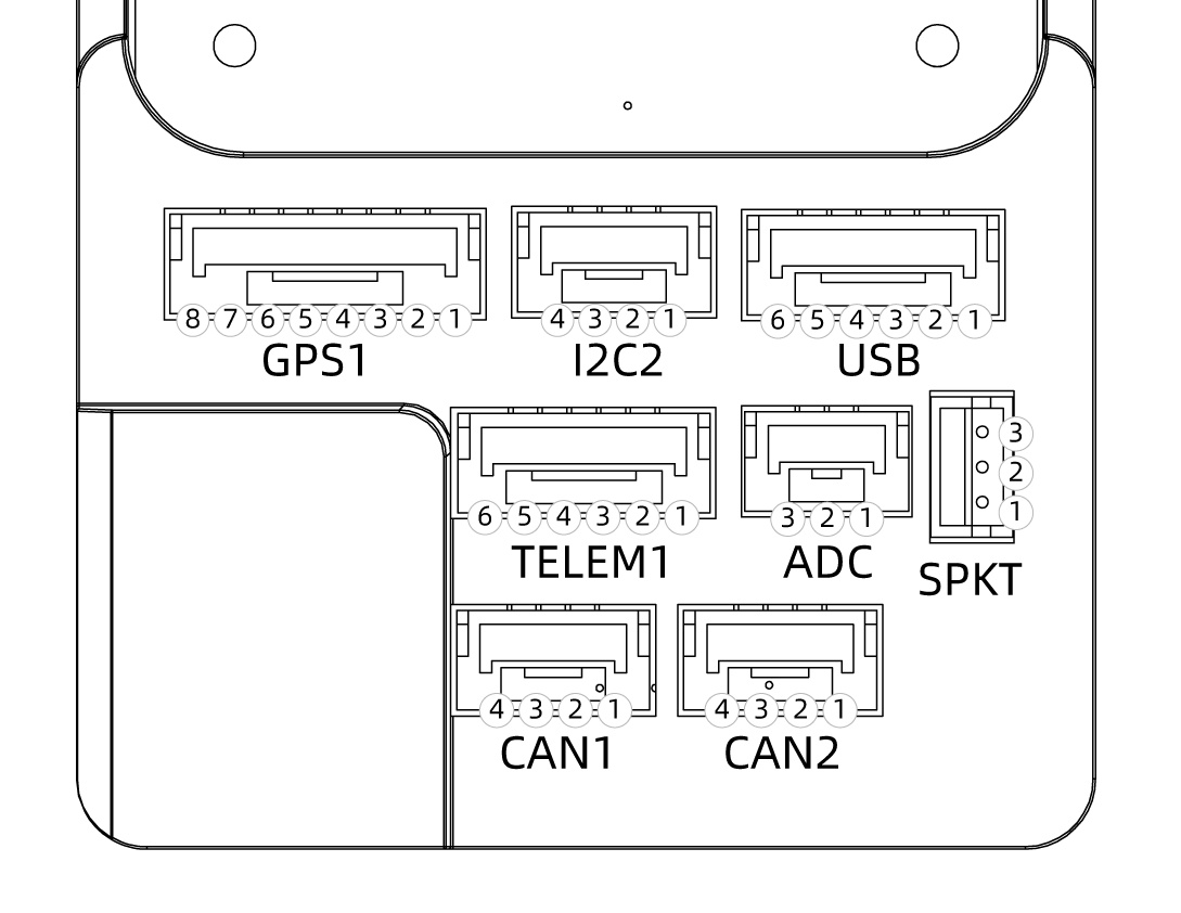| `TELEM2`  | JST-GH 1.25 mm (6-pin)      |