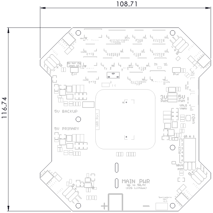Although this carrier board is geometrically optimized for quadcopters, X8 configurations, and octocopters, it provides connections that can support the various functions supported by The CUBE. Thus, it can be integrated into any vehicle type supported by The Cube, which includes various multi-rotor frame types, planes, rovers, submarines, and antenna trackers.
