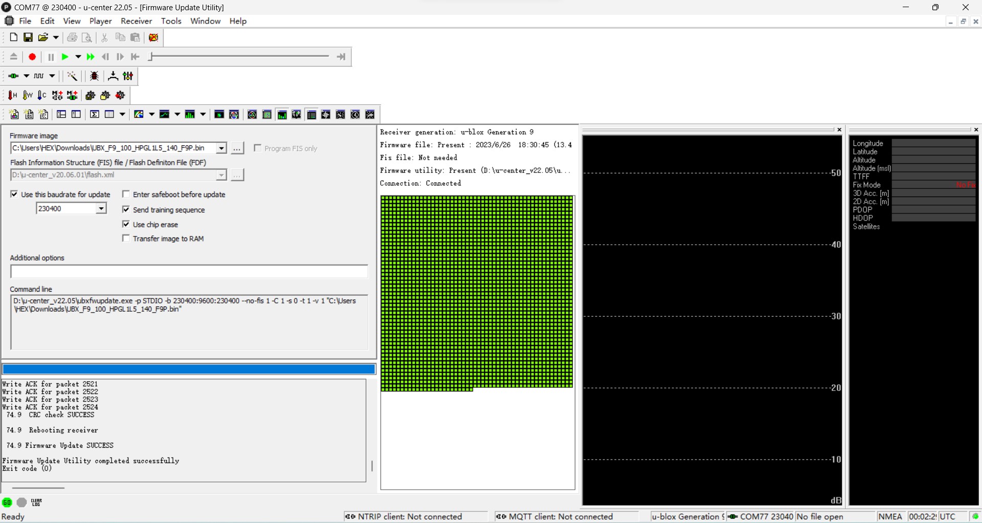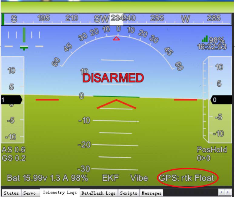 After the base station is set up, you can turn on the UXV. Using the same telemetry module to connect Mission Planner, the base station data will be transmitted through the telemetry module to the Here 4 rover module on the UXV. In the Mission Planner main page, you can see the current GPS status displayed as RTK Float / RTK Fixed / 3D RTK, indicating that the positioning of the UXV has entered the RTK mode. RTK Float is a floating-point solution; RTK Fixed is a fixed solution. RTK Fixed mode has higher accuracy and requires better signal strength. 3D RTK is unified saying of RTK Float / RTK in the Mission Planner version.