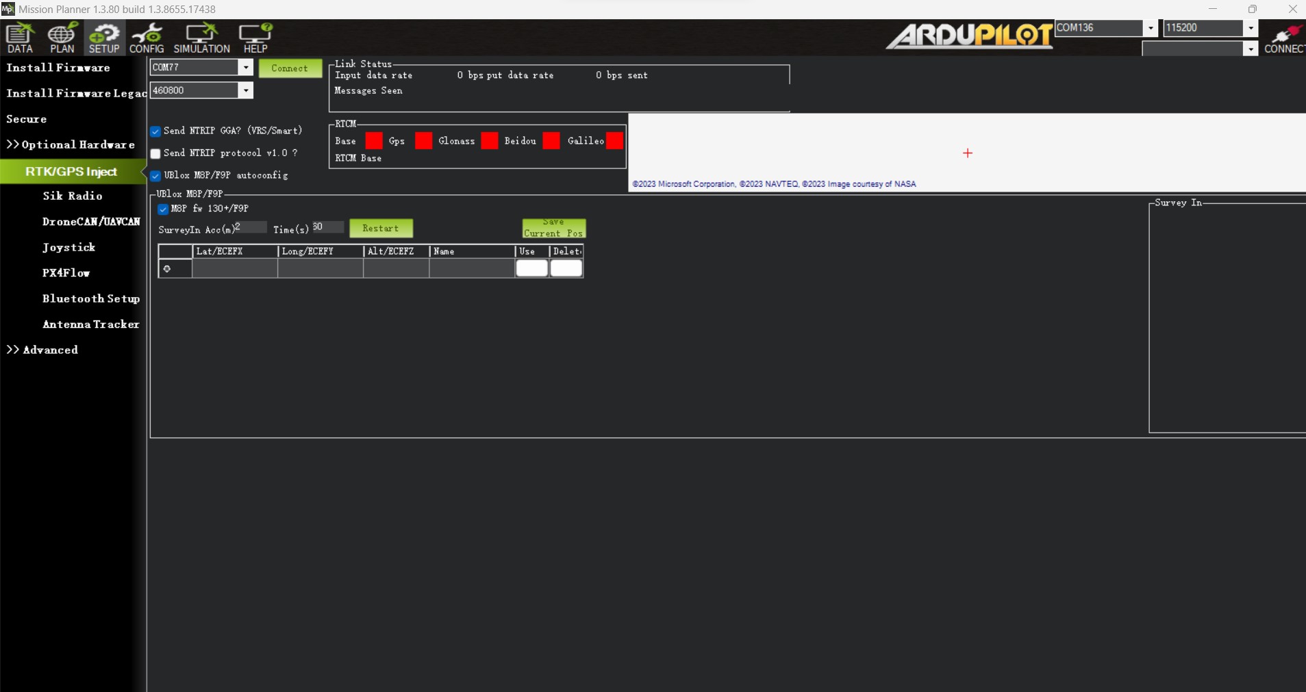 Select the correct base module com port in the top left corner and click connect. In the SurveyIn Acc section, enter the absolute geographic accuracy that you expect your Here 4 Base station to achieve. In the Time column, enter the minimum survey time you expect. Click on Restart, the ground station will transfer the data you have entered to the Here 4 base module, the base module will start a new round of surveying. You will see the following page: